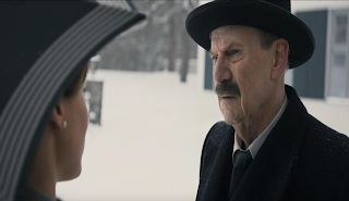 We cut to 1940, and we listen to a radio report of Nazi ships being sunk off the coast of Norway by British and French forces. We cut to King Haakon (Jesper Christensen) outside holding an umbrella as snow falls, while he covers his face with his hand. We cut to the King walking in deep snow as he searches for his grandchildren who he is playing hide and seek with. He slowly sneaks up to two cars parked in front of a mansion and opens one of the doors, finding a child inside hiding. He happily pulls the boy out of the car, both laughing. He then moves over to the other vehicle and opens the door to find his two granddaughters. The daughters argue with the boy on who should be it, and the King tells them he will be ‘it’ again. The King starts counting down from ten as the three children scamper off.